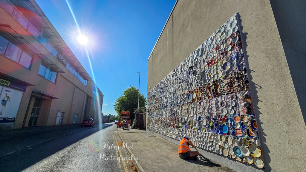 ‘Crockery Mountain’ is a community mosaic made of plates, cups, bowls, saucers and teapots! It is installed on a wall in Dungarvan, County Waterford, Ireland. This is an environmental artwork featuring thousands of surplus, sentimental and damaged pieces of crockery that that were donated by members of the public.
